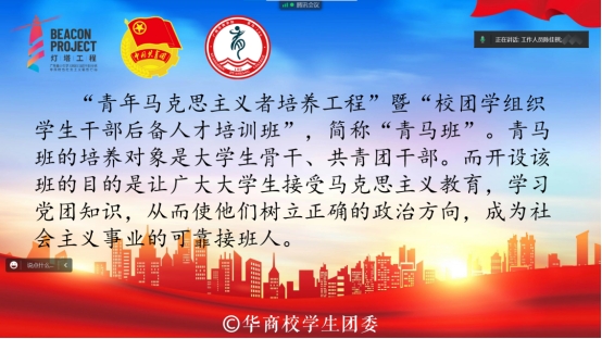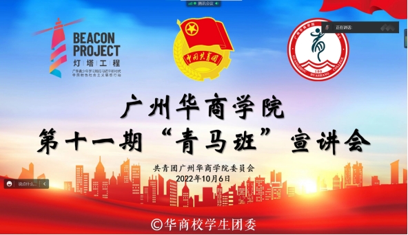 为深入学习宣传贯彻习近平总书记在庆祝中国共产主义青年团成立100周年大会上的重要讲话精神,激励华商青年牢记青春使命,践行“请党放心,强国有我”的青春誓言,成长为中国特色社会主义事业的合格建设者和可靠接班人。必赢626net入口第十一期“青马班”学员选拔宣讲会于10月6日晚上19:30在线上开展。